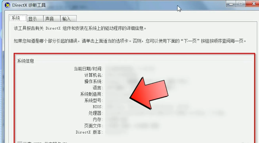 在DirectX诊断工具的“系统”和“显示”选项卡下即可查看电脑配置