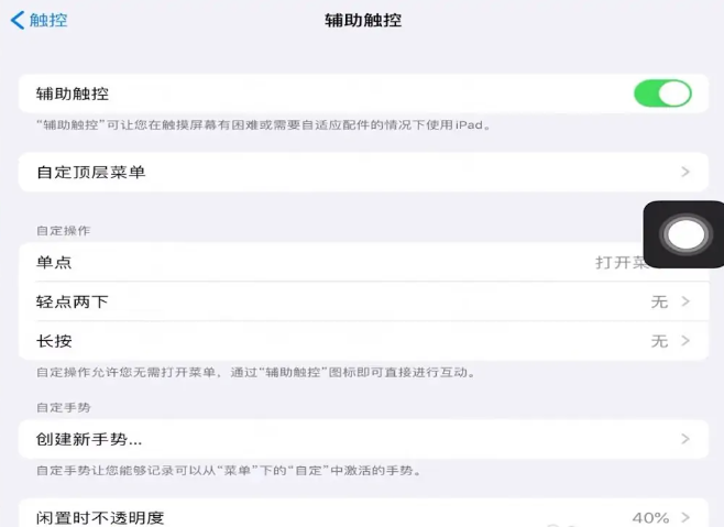 2、打开 iPad “设置”-“辅助功能”-“触控”,开启“辅助触控”,并且可以自定义操作,例如,将“轻点两下”设置为“截屏”,在任意界面中,可以轻点两下小白点进行截图。