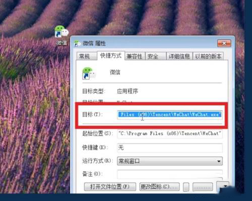 2、在微信属性窗口中,找到“目标”项,复制目标项文本框内的内容。