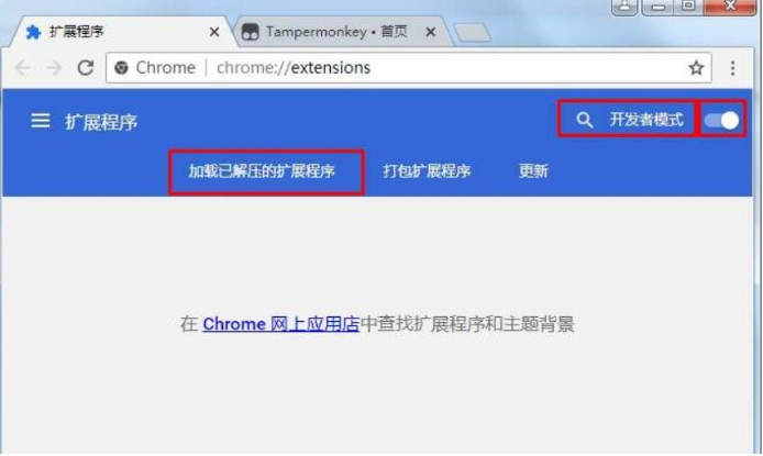3、打开谷歌浏览器,打开扩展程序-打开开发者模式-点击 加载已解压的扩展程序。