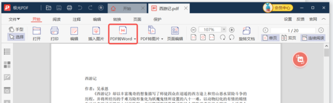 1、首先自行搜索并下载安装极光PDF,打开需要转换格式的PDF文件,选择“PDF转Word”功能。