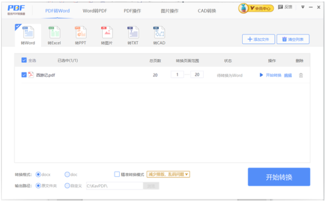 2、接着需要设置好转换范围、输出格式、输出路径后,就可以点击开始转换,过一会我们的PDF文件就成功转换成Word文档了。值得一提的是,转换选项中还提供了精准转换模式,即便PDF中是图片,也能将图片上的文字提取出来,并且尽可能的保留原来的排版。