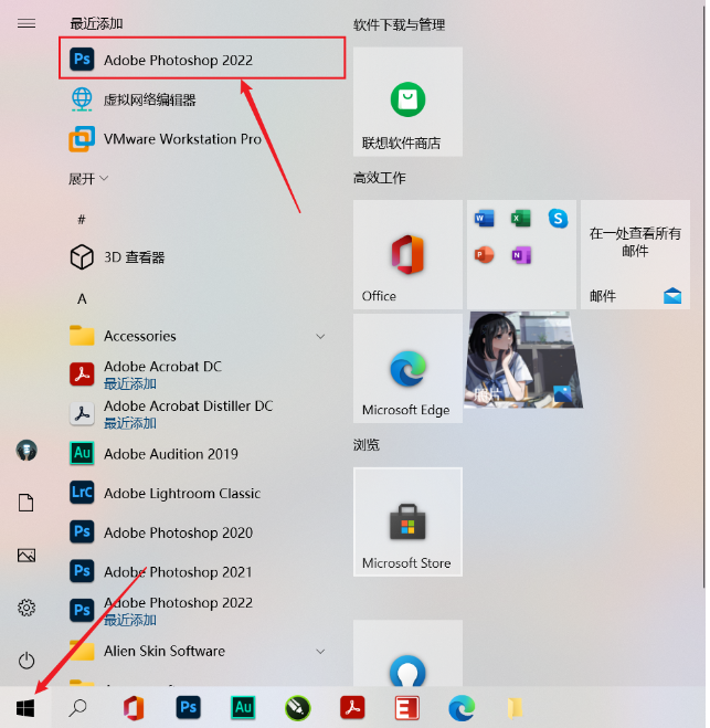 7、这时可以看到电脑桌面自动生成一个快捷图标。我们也可以点击桌面左下角按钮,找到【Adobe Photoshop CC2022】直接拖拽到桌面即可生成快捷图标。