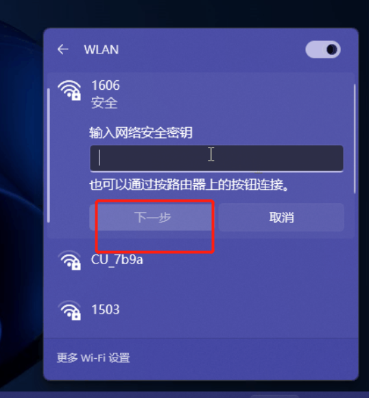 4、选择wifi并输入密码,输完密码点击“下一步”按键连接wifi。