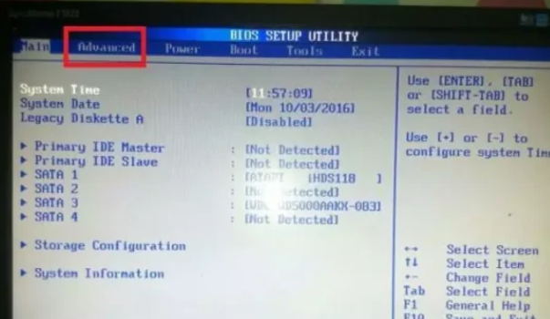 2、进入bios界面后,点击上方的“Advanced”的选项。