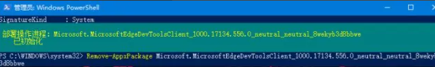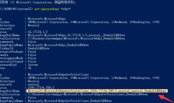 2、在这里输入代码 get-appxpackage *edge*,查找edge浏览器的安装包名称。
