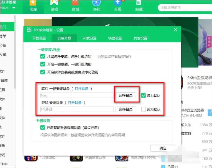 2、在弹出的窗口中切换到安装升级选项下,然后点击选择目录即可自定义设置下载路径。