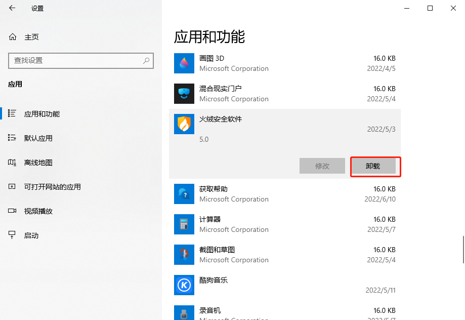 4、在应用和功能下找到火绒安全软件,选中它,点击卸载即可。如果提示需要重启电脑才能完成卸载,重启电脑即可卸载干净。