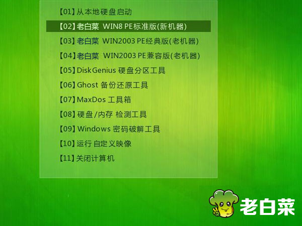 5、将制作好的老白菜u盘启动盘插入usb接口,重启电脑,用u盘启动电脑,选择“【02】老白菜Win8PE标准版(新机器)”回车确认。