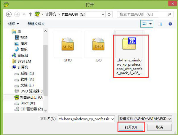 7、找到原版xp系统镜像包,点击“打开(O)”进入下一步操作。