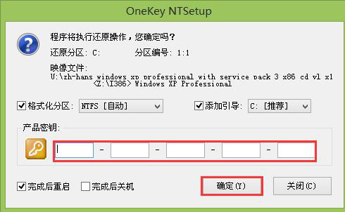9、输入从网上搜索来的原版xp密匙,点击“确定(Y)”进入下一步操作。