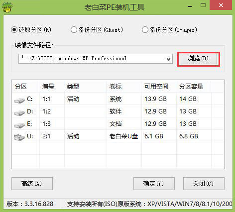 6、进入pe系统桌面,系统会自动弹出老白菜PE装机工具窗口,点击“浏览(B)”进入下一步操作。