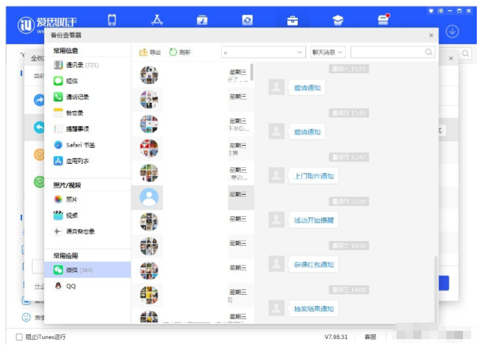 爱思助手大家用的比较多了,但可能有些人不知道爱思助手也是能查看微信聊天记录备份的,不仅可以从爱思助手自己的备份文件里查看微信聊天记录,也可以从iTunes备份里读取微信(QQ也可以哦)聊天记录,但是不能单独保存微信的所有聊天记录,只能先全备份再查看微信记录,且只能导出纯文本模式的聊天记录,且没有增量模式,每次都必须重新备份。