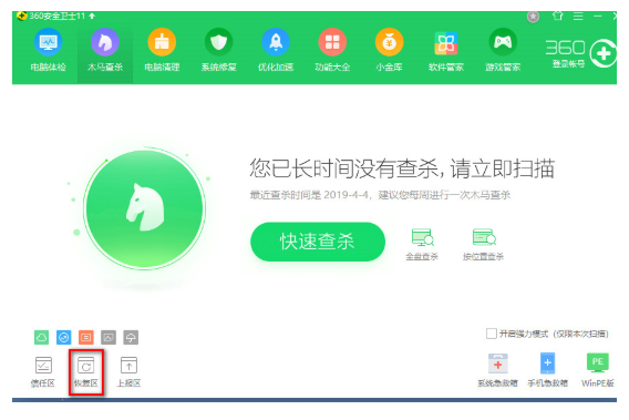 2、我们在木马查杀界面中选择左下角的恢复区。