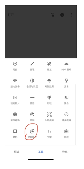 2.打开图片后我们点击底部的工具按钮,选择“双重曝光”功能。