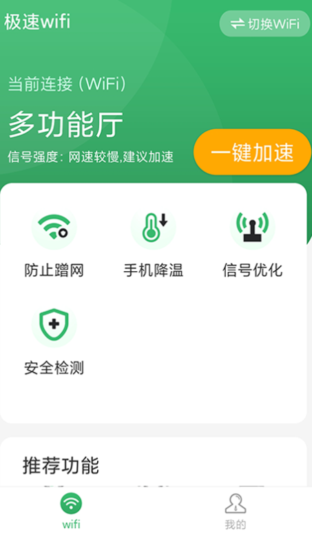 极速wifi能大力提高上网的信号强度,感觉家里的网络卡就可以开启极速wifi一键测速,方便使用极速wifi进行网络优化操作。另外还适用于查找最佳网络区域,在户外时需要连接无线,只需打开该应用查找最佳的网络连接,就可以自动连接到安全可靠的公共wifi热点等使用。