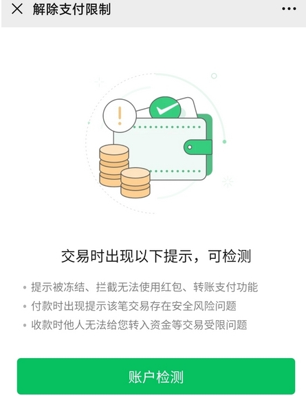 6、点击“账户检测”,就可以根据提示操作解决即可,一般实名认证之后可以有效的提高微信支付额度。