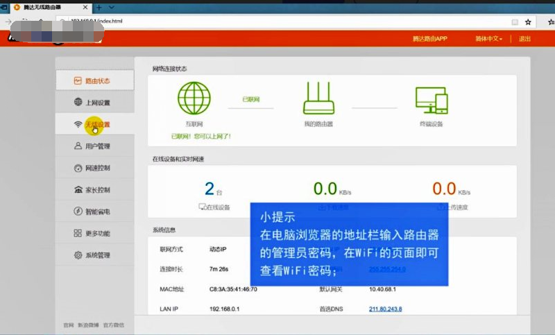2、然后在浏览器地址栏输入路由器的登录地址以及管理员密码进入,在WiFi页面即可查看WiFi密码。