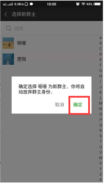 7、选择新的群主(也就是你),选中新群主后会跳出一个会话框“确定选择XXX为新群主,你将自动放弃群主身份。”点击“确定”群主权限就变更完成了。