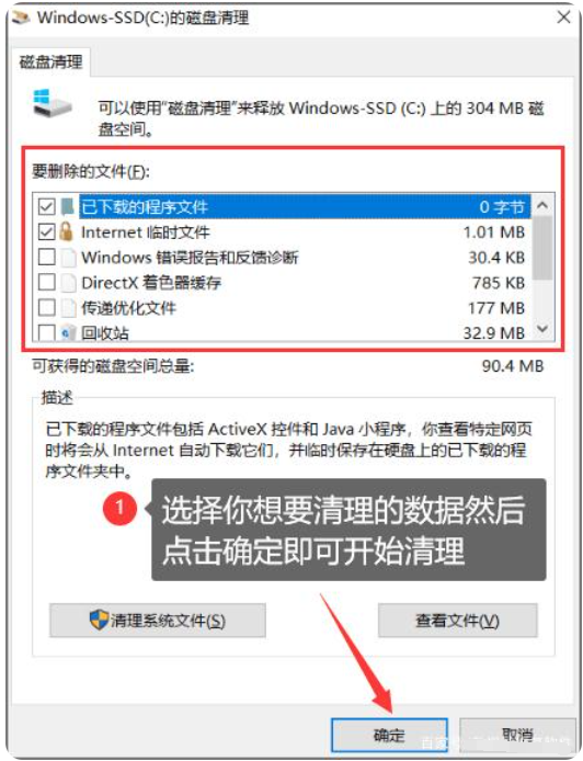 2、然后只需要选择想要清理的文件数据,再点击一下确定开始清理,等待系统清理完成即可。