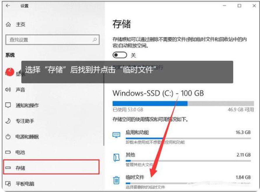 2、继续点击“系统”进入,然后选择“存储”,随后点击“临时文件”。