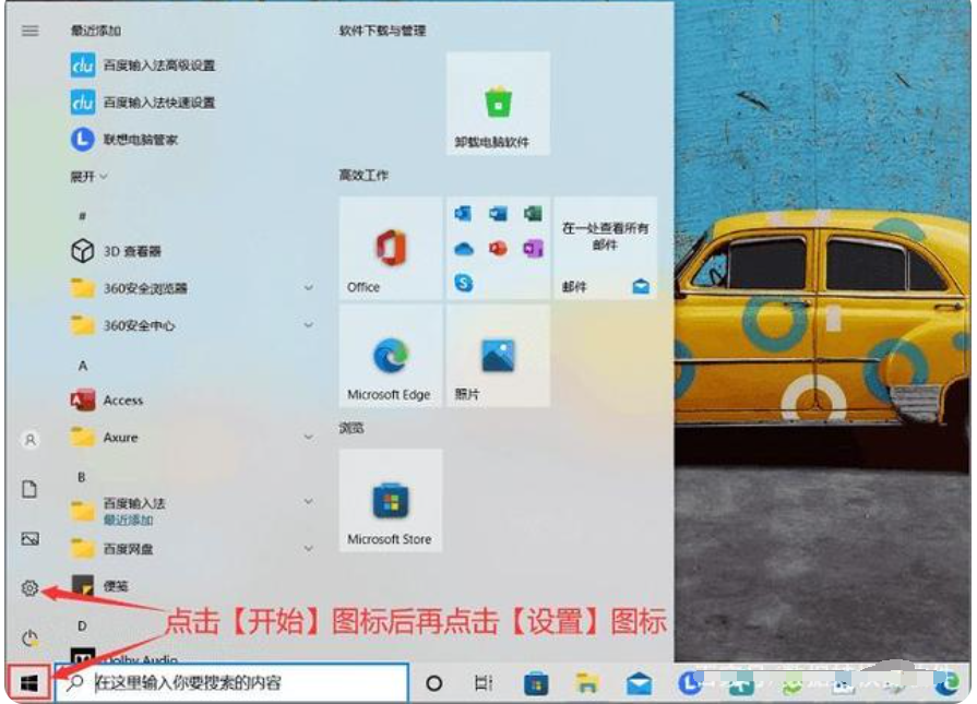 1、鼠标单击【开始】图标(桌面左下角),选择“设置”进入。