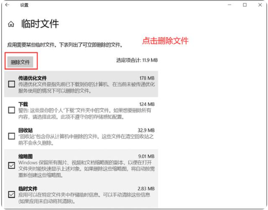 3、在临时文件里,点击“删除文件”即可清理完成。