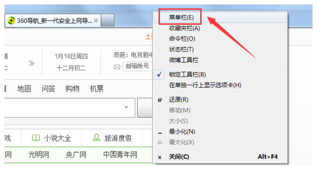 2、在浏览器上方空白处,鼠标右击,出现下拉列表,选择“菜单栏”。