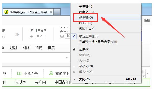 4、在下拉列表中点击“命令栏”,浏览器则出现一系列的工具按钮。