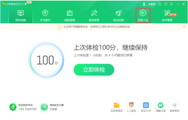 1、下载并运行360安全卫士,在界面的顶部找到【功能大全】功能,并点击进入。