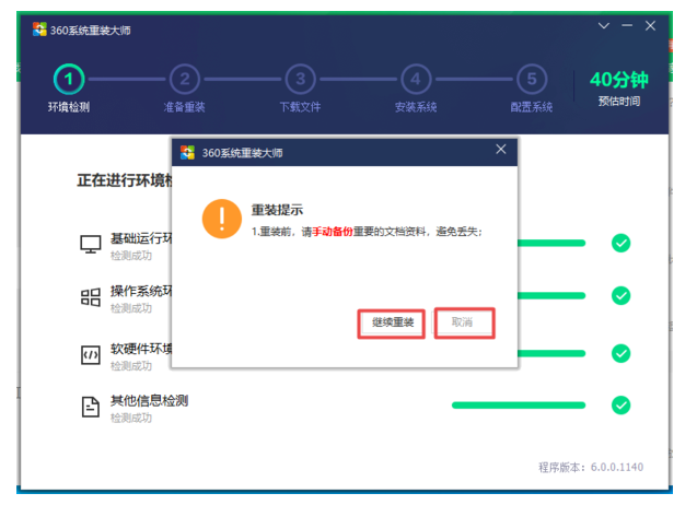 6、已经备份了电脑上的重要资料的话,就点击【继续重装】即可。