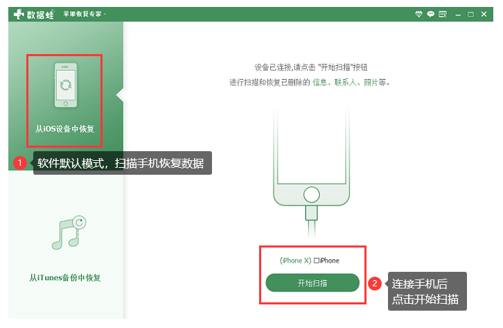 2、连接成功,选择软件首页左上方的【从IOS设备中恢复】扫描方式,点击【开始扫描】选项即可开始扫描手机数据。如此页面显示手机连接不成功,请重新连接手机或者更换数据线再进行连接。