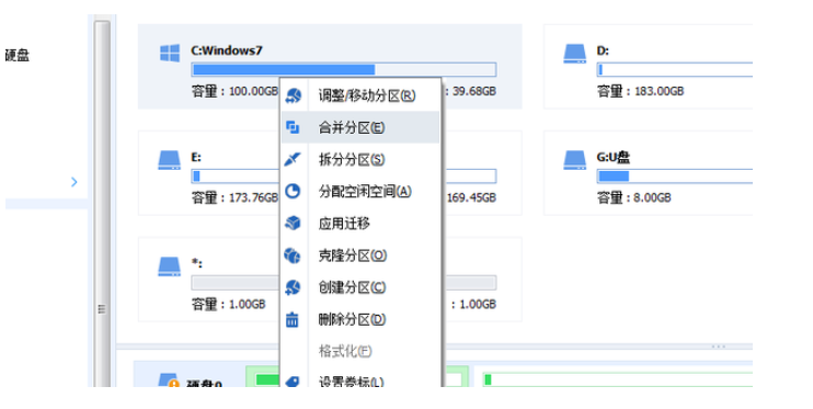 4、右键点击C盘选择合并分区。