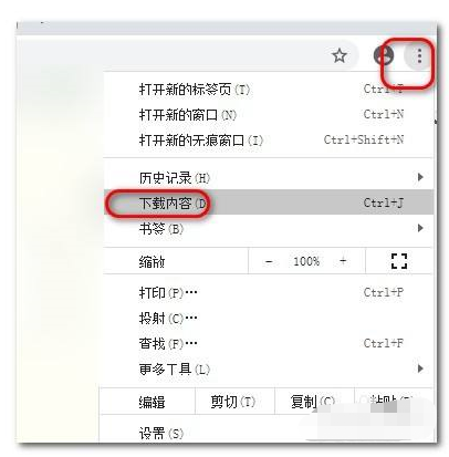 5、点击浏览器右上角图标,弹出菜单后点击下载内容。