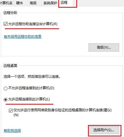 3、在上方切换到远程,然后设置允许远程协助连接这台计算机,设置允许远程连接到此计算机。