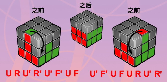 6、然后让中层边块归位。把白色面转向下,找出红绿边块,若红绿边块在顶层则按顺时针方向转动顶层,直到边块与图上的1个情况相同,在按照口诀转动魔方,使边块归位。若红绿边块在中间某层,但位置错误或颜色错误,则先使红绿边块在右前方的位置,再重新按照下面其中一个次序旋转1次。