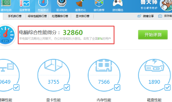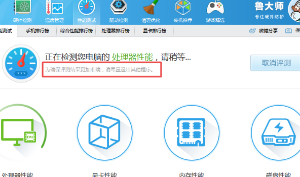 3、然后在软件的性能测试界面后,直接点击【开始评测】按钮,此时软件就会开始对电脑的处理器性能、显卡性能、内存性能和硬盘性能开始进行跑分了。