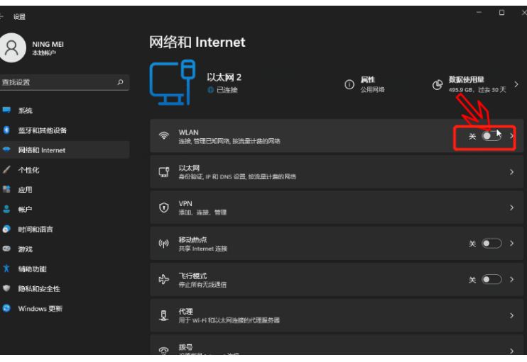 2、点击WLAN旁边的开关按钮变成“开” 。