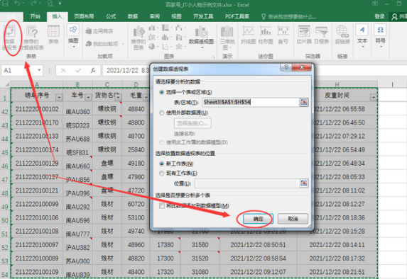 3、点击【数据透视表】,创建数据透视表对话框中点击【确定】;