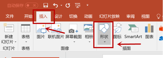 1、打开ppt文档,选择“插入”,单击下方的“形状”。