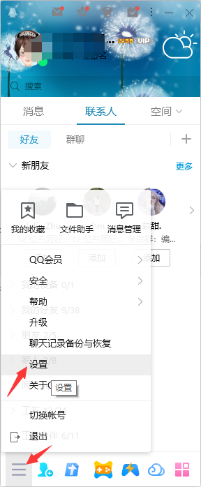 1、点击qq栏目下方的主菜单,然后选择设置进入。