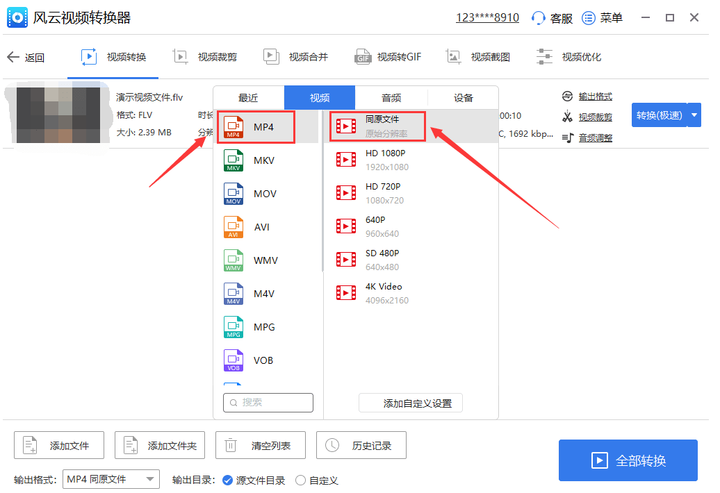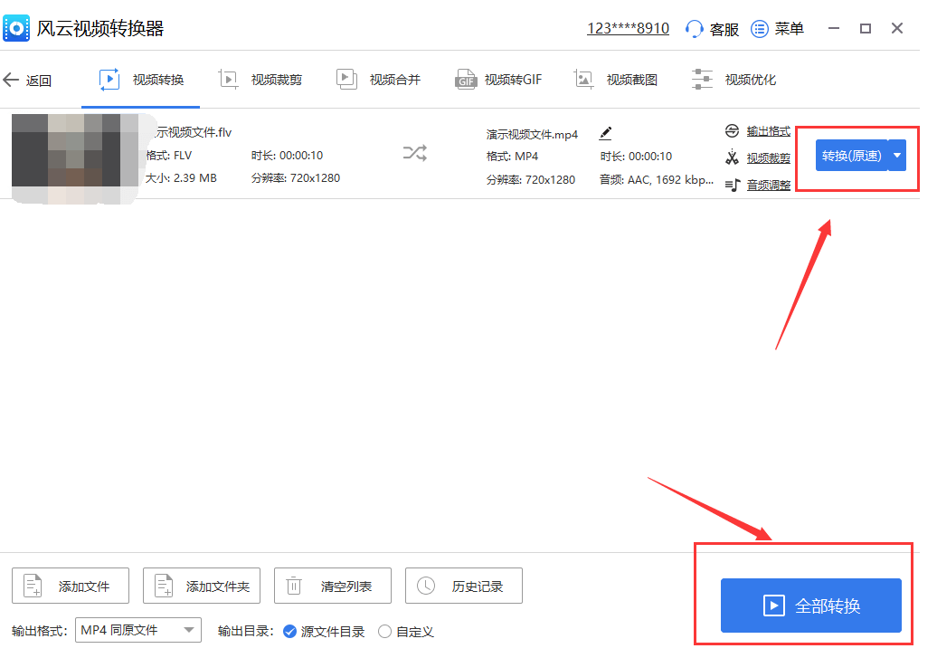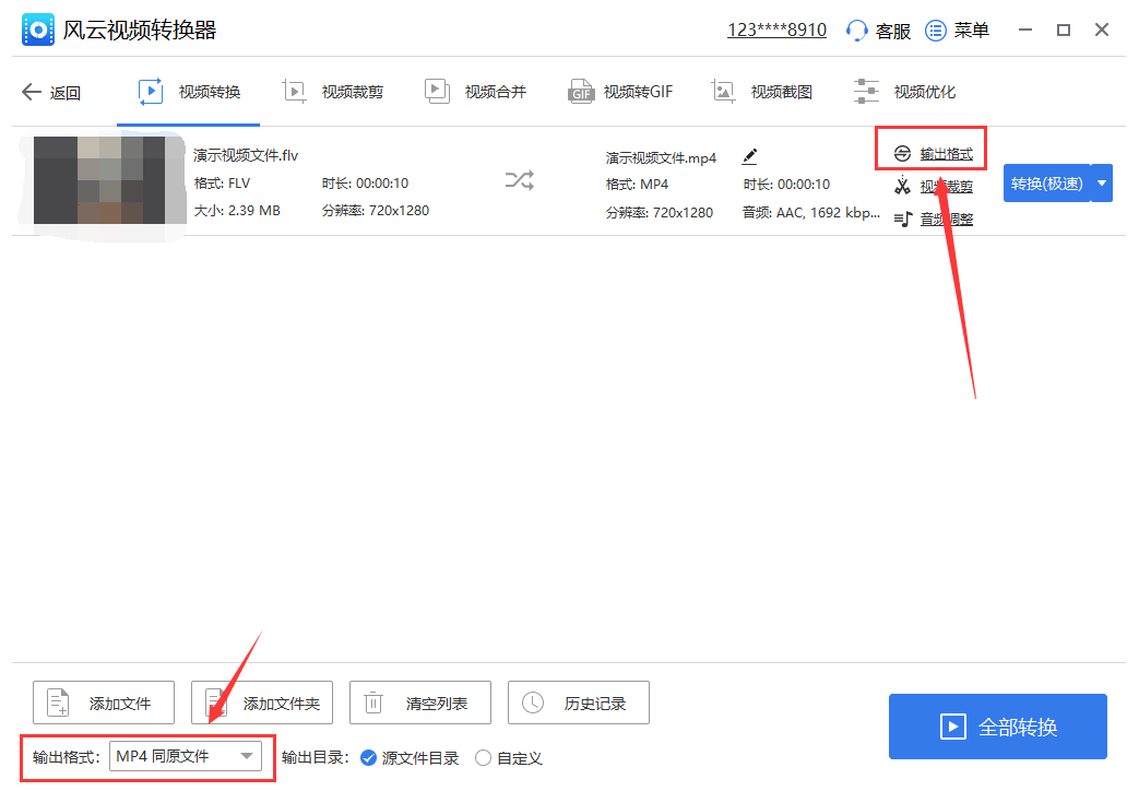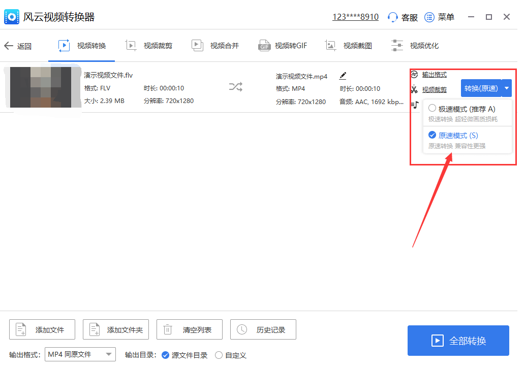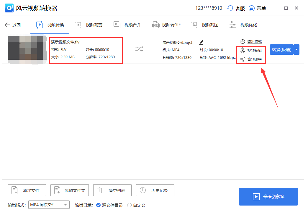 3、随后将需要转成mp4的视频文件添加到列表之后,即可看到视频文件的格式、大小、分辨率、时长等视频详细的信息,若您有需要可以点击“视频裁剪”或“音频调整”进行适当调整。4、完成上述操作后,点击“输出格式”,即可选择需要转换的格式。5、随后在弹出的格式输出选择的窗口中点击“MP4”,转换的分辨率选择为“同原文件”,如有需要其他分辨率的可按照自身的需要进行选择。6、完成以上步骤都后,点击转换旁边的倒三角,将画质设置为“原速模式”,这样可以确保视频的兼容性更强。7、转换模式设置好以后,点击“全部转换”,或者“转换”按钮,即可将哔哩哔哩下载的视频进行MP4的转换了。8、视频转换完成之后,就会跳出“打开”按钮,也意味着视频转换成功。有需要的话可以点击“打开”,在跳转的弹窗文件夹中就能查看到最终MP4格式的视频了。