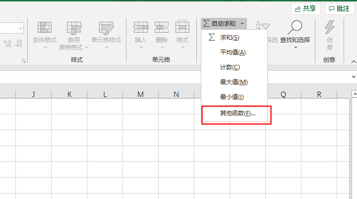 3、如果不记得函数,那么先选中单元格,然后在【开始】菜单中点击【编辑】,找到【自动求和】,在下拉框中选择其他函数。