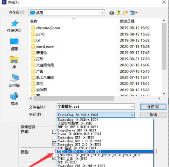 5、将存储的格式改为“JPG”格式,这样下次就可以直接通过图片的形式打开。