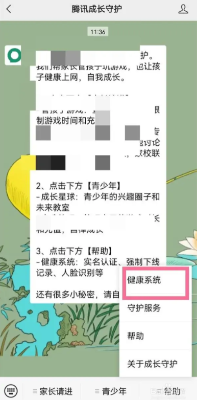 1、关注微信腾讯成长守护公众号,点击帮助导航栏,选择【健康系统】。