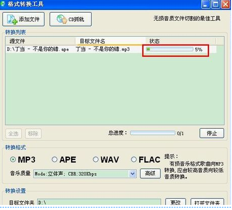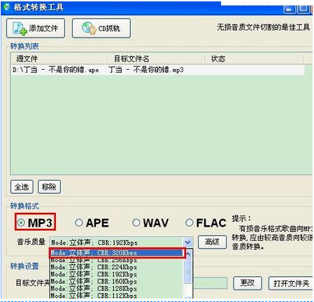 7、转换格式是mp3,在音乐质量的下拉菜单里,选择320kpbs码率就可以啦。