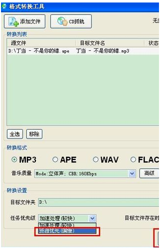8、因为我们追求的就是音质,所以在处理文件时我们当然要以资源质量为考虑优先条件,选择资源优先(偏慢),点击转换文件即可。