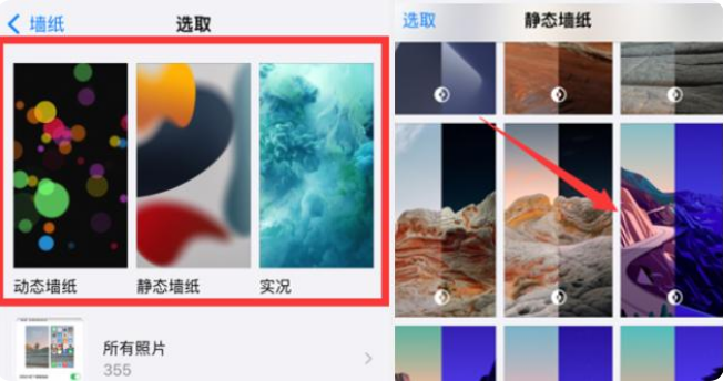 2、打开选取墙纸界面之后,我们可以选择系统提供的墙纸类型,也可以点击下方的所有照片,然后会打开相册选择自己喜欢的图片。这里以设置系统提供的墙纸为例子,方式是一样的。随后在打开的系统提供墙纸中,点击打开自己喜欢的墙纸即可。