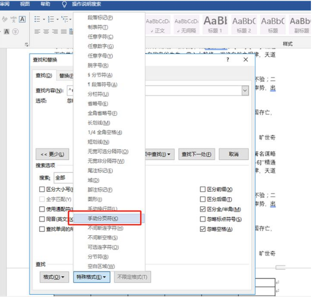 1.使用Word快捷键「Ctrl+H」打开查找替换窗口,然后单击「高级」或「更多」,在「特殊格式」中选择「手动分页符」。