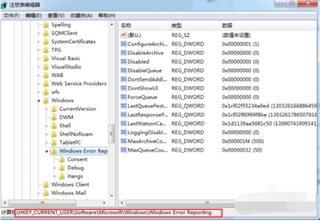 3、然后在注册表中依次展开文件夹:HKEY_CURRENT_USER-Software-Microsoft-Windows-Windows Error Reporting。